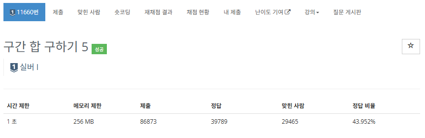 https://www.acmicpc.net/problem/11660 풀이1(누적합)우선 누적합을 이용해 2차원 배열에 값을 채워넣는다(배열의 (i, j)에는 (0, 0)부터 (i, j)번째까지의 모든 값이 담긴다. 즉, (i + 1, 0) 위치에는 (i, n)까지의 합에 (i + 1, 0) 번째 수가 더해진 값이 들어가게 된다)답은 각 행의 x2의 누적합 - x1의 누적합을 행의 갯수만큼 반복하여 더해주면 된다위 배열이 주어졌다고 가정했을 때, 누적합을 이용해 배열을 채우면 아래와 같다제출 코드#include using namespace std;int ps[1025][1025];int main(){ ios::sync_with_stdio(false); cin.tie(0); cout.tie(..